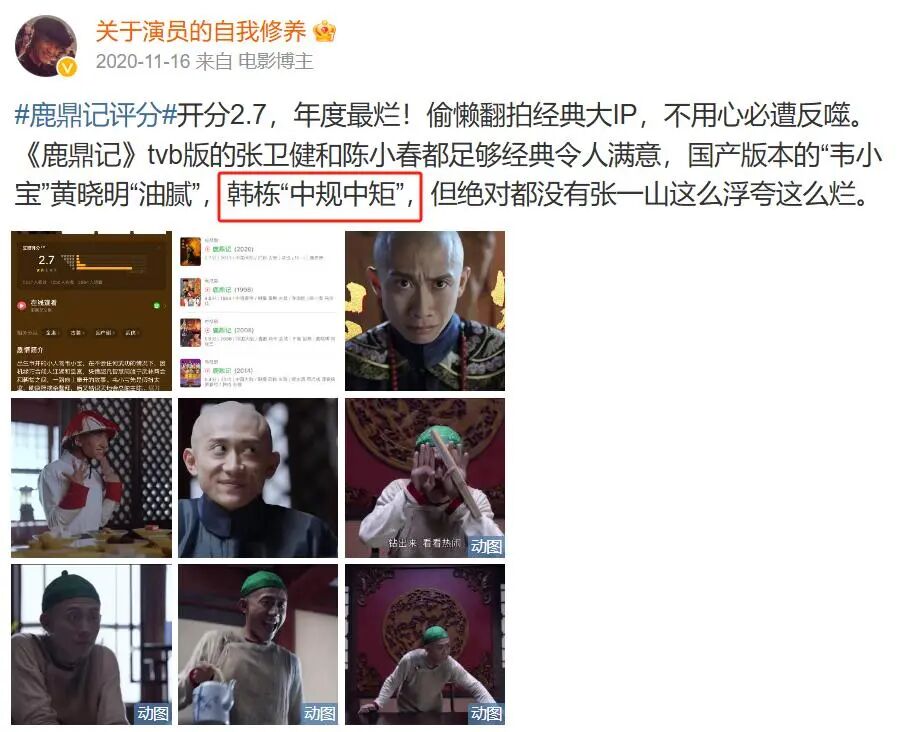 但风水轮流转,2020年张一山演的《鹿鼎记》上映后,大家对韩栋的看法完全变了;